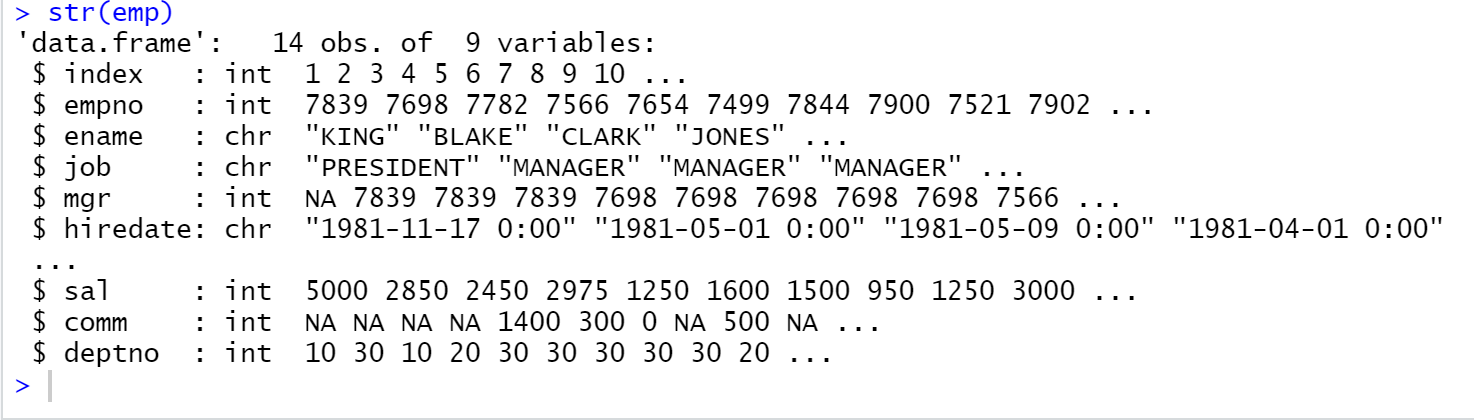 문제3. emp데이터 프레임의 구조를 확인하시오.