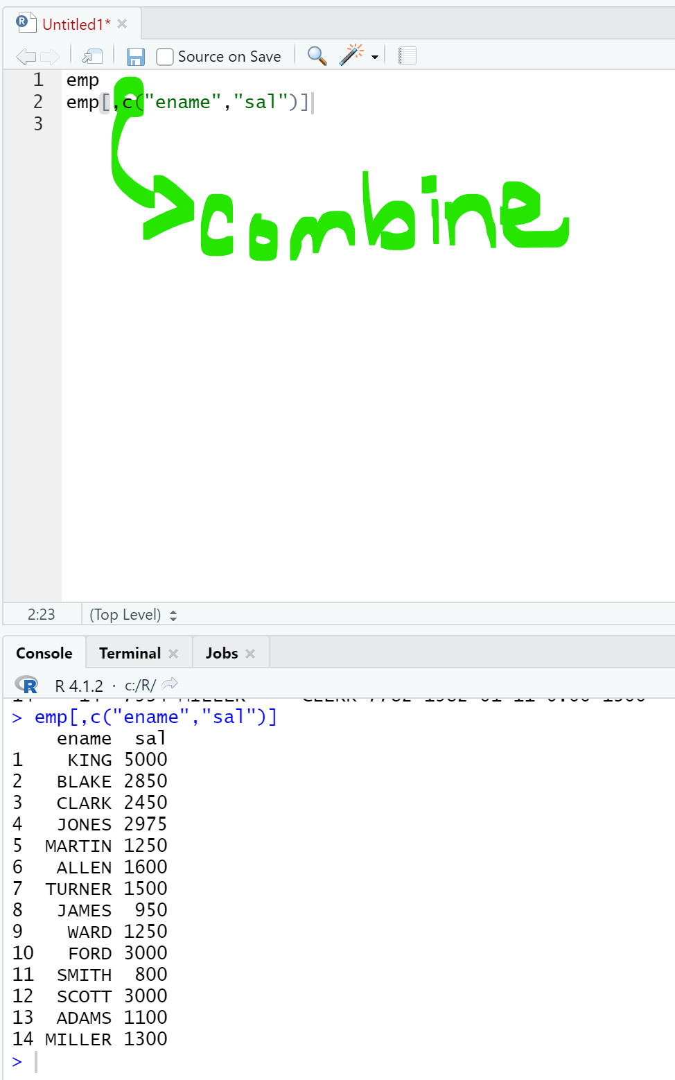 result <- emp[emp$job == 'SALESMAN', c("ename","sal")]