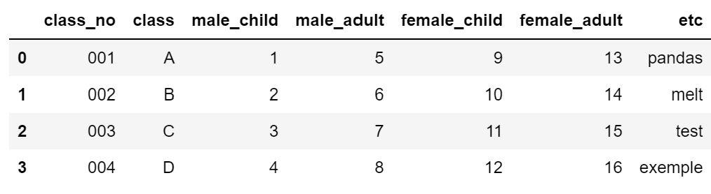 male_child 뿐만 아니라 male_adult, female_child, female_adult 도 데이터에 녹여내려면, value_vars에 리스트를 사용하여 컬럼명을 묶으면 된다.