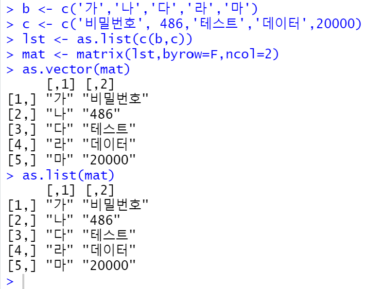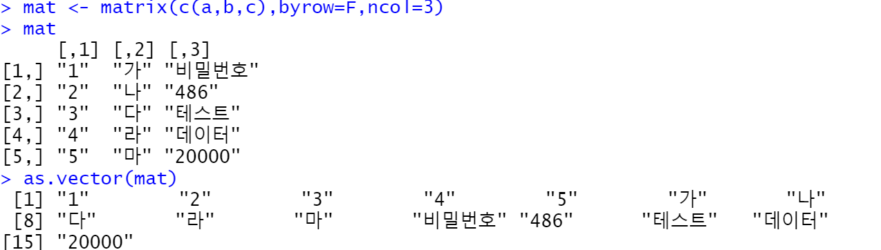 | 행렬(mat) > 벡터 | as.vector(mat) | 행렬의 모든 원소를 벡터로 |