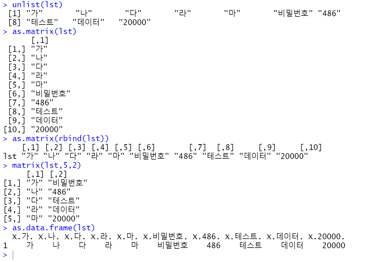 | 리스트(lst) > 벡터 | unlist(lst) | as.vector()보다는 unlist()쓰는 걸 추천 |