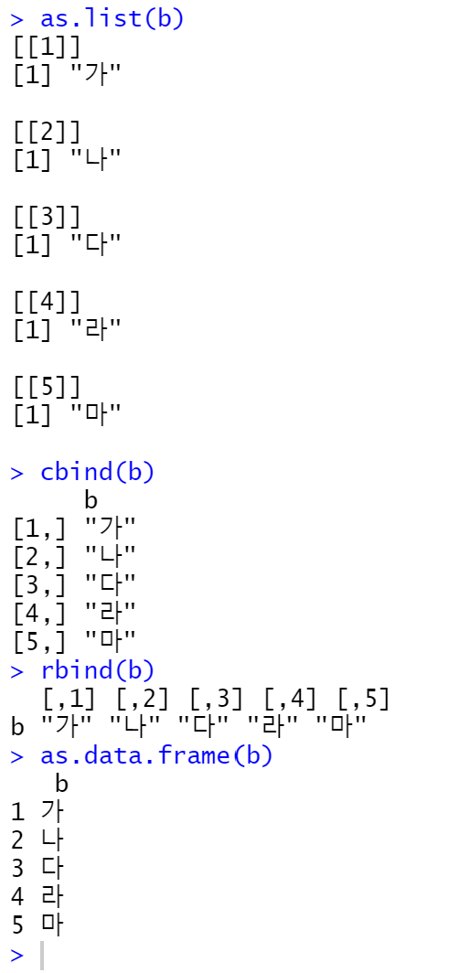 | 데이터 프레임 > 리스트 | as.list(dfrm) | dataframe은 이미 리스트이기 때문에 이 경우 의미 없음. |
