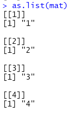 | 행렬 > 리스트 | as.list(mat) | 행렬의 모든 원소를 리스트로 |