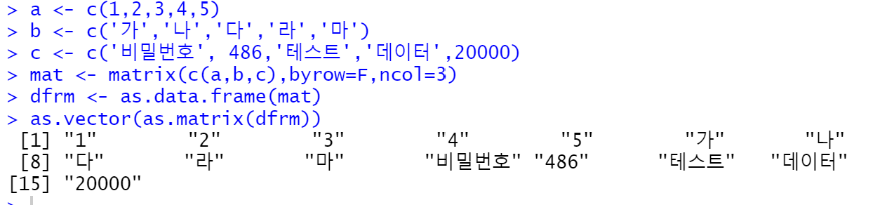 | 데이터 프레임(dfrm) > 벡터 | 행 하나짜리 데이터 프레임 변환 : as.vector(as.matrix(dfrm)) 열 하나짜리 데이터 프레임 변환 : dfrm[ ,1] 또는 dfrm[[1]] |