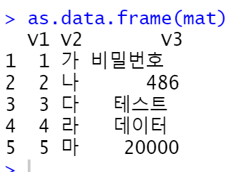 | 행렬 > 데이터 프레임 | as.data.frame(mat) |