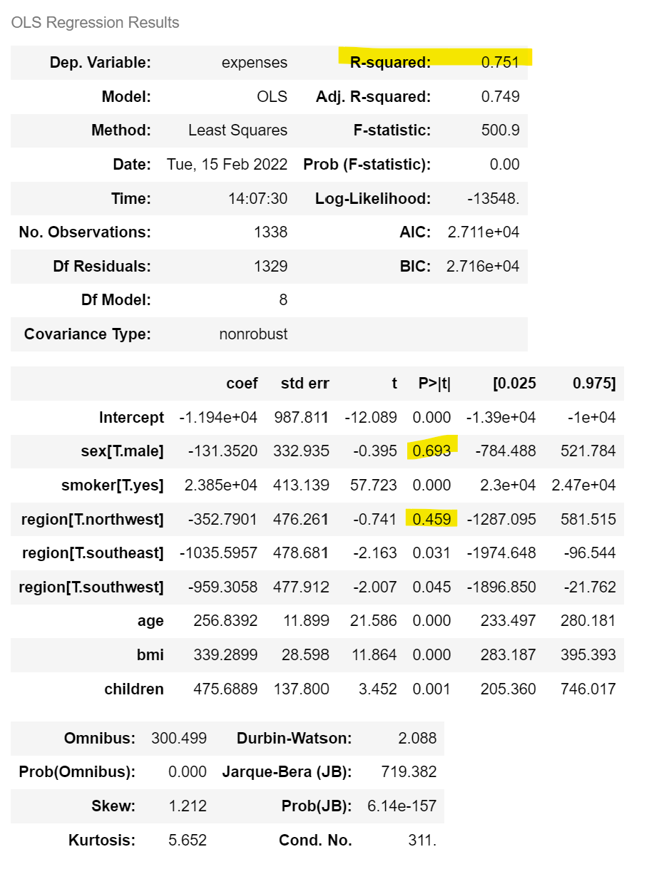 model2 = smf.ols(formula = 'expenses ~ age+sex+bmi+bmi30+children+smoker+region', data = insurance)