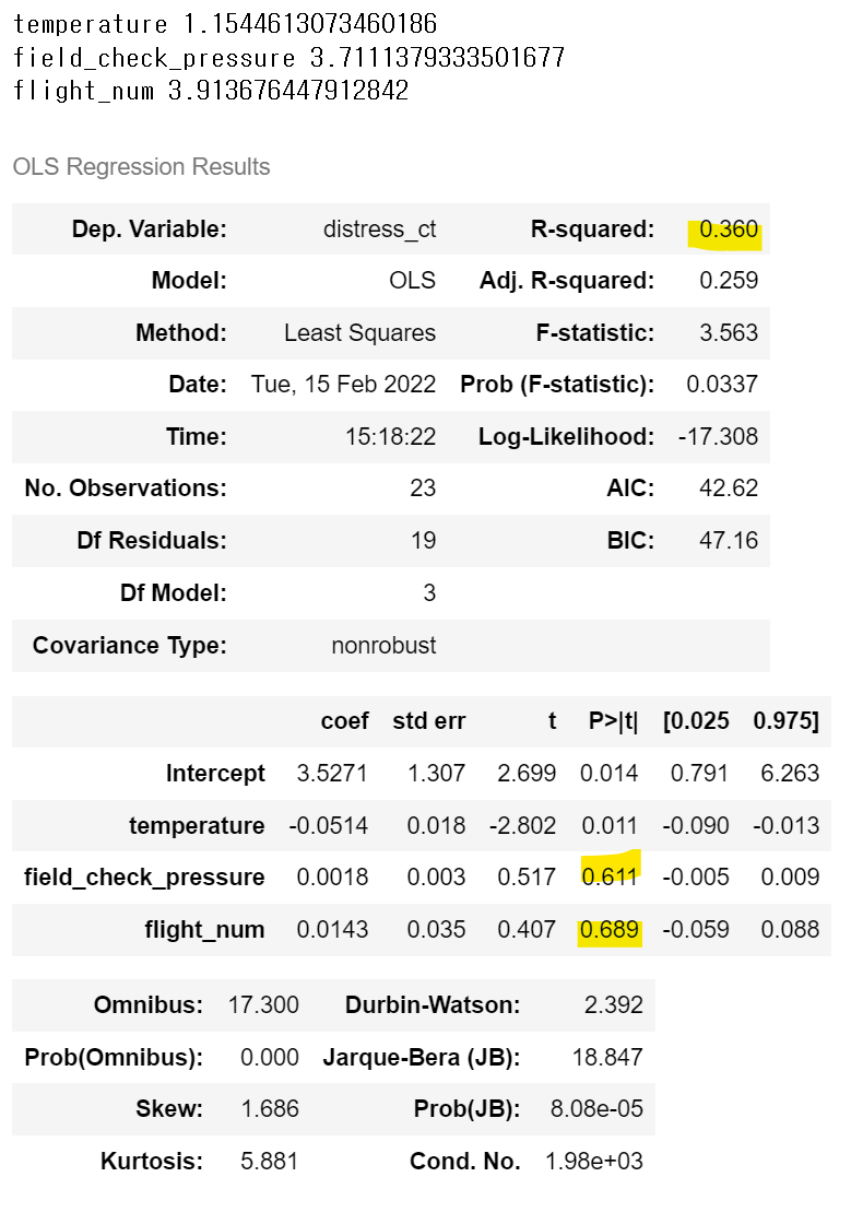 문제320. 파이썬으로 다중회귀모델을 생성하는데 우주왕복선 데이터의 o형링 파손에 영향을 미치는 독립변수들 온도, 압력, 비행기 번호중에 어떤게 가장 영향이 큰지를 확인하는 다중회귀모델을 생성하시오.