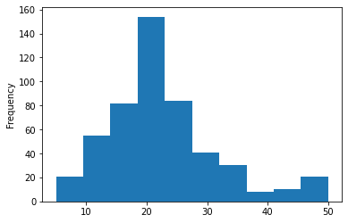 boston.price.plot(kind = 'hist')