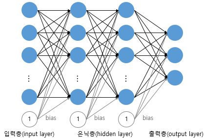 다층 신경망(시그모이드) : 입력층 ---> 은닉층 ---> 출력층