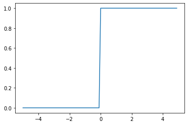 1. 계단함수 : 입력신호의 총합이 임계치를 넘느냐 안넘느냐를 숫자1과 0으로 리턴하는 함수