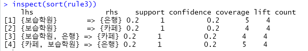 rule3 <- subset(rule2, subset = lhs %pin% '보습학원'&confidence > 0.7)