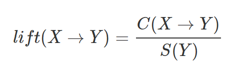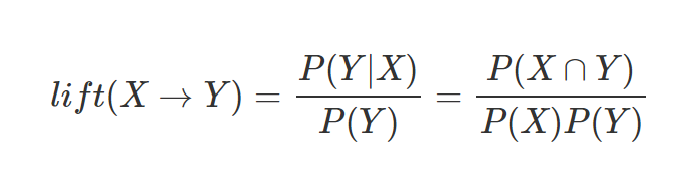 즉, (X와 Y를 모두 포함하는 거래건수)를 (X를 포함하는 거래건수 * Y를 포함하는 거래건수)로 나눈 것.