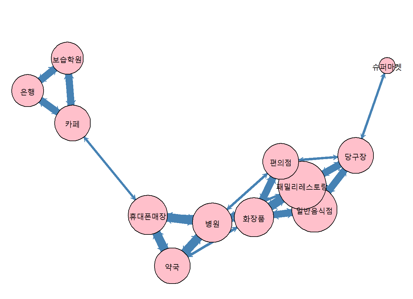 > 일반음식점이 있는 곳에 패밀리 레스토랑이 있고, 약국이 있는 곳에 병원이 있다는 연관성을 확인할 수 있음
