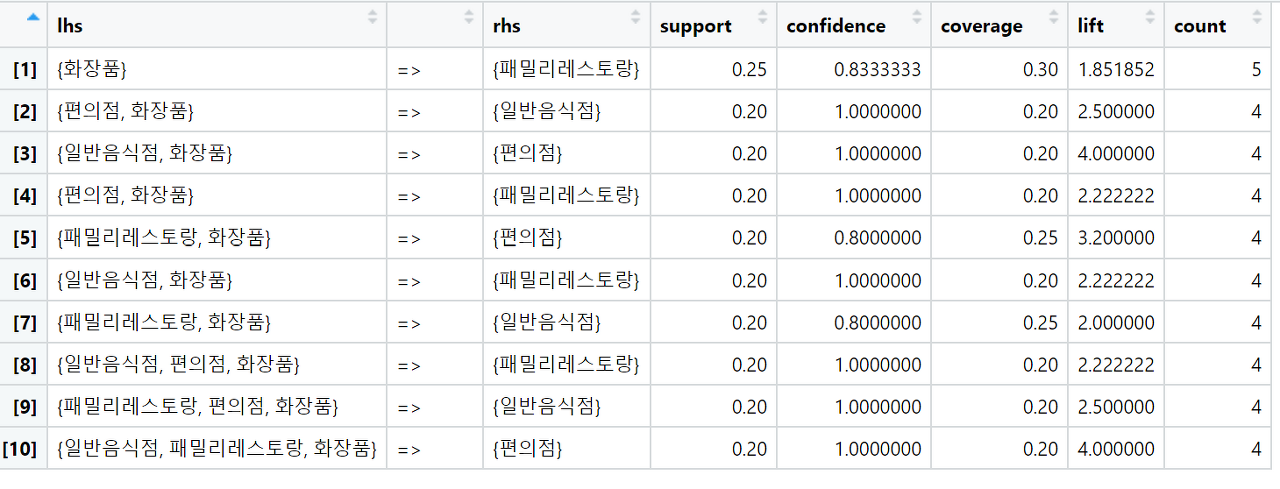 rule_cosmetic <- subset(rule2, subset = lhs %in% '화장품'&confidence > 0.7)