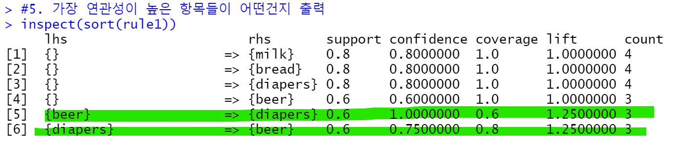# 맥주 -> 기저귀 지지도(sup), 신뢰도(con), 향상도(lift)