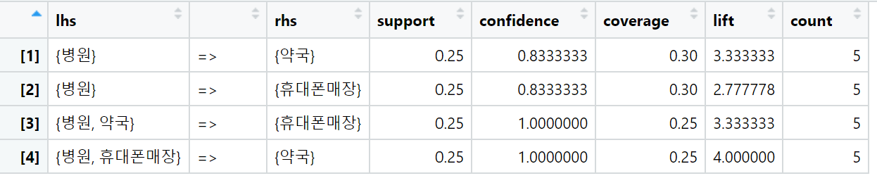rule5 <- subset(rule2, subset = lhs %in% '병원'&confidence > 0.7)