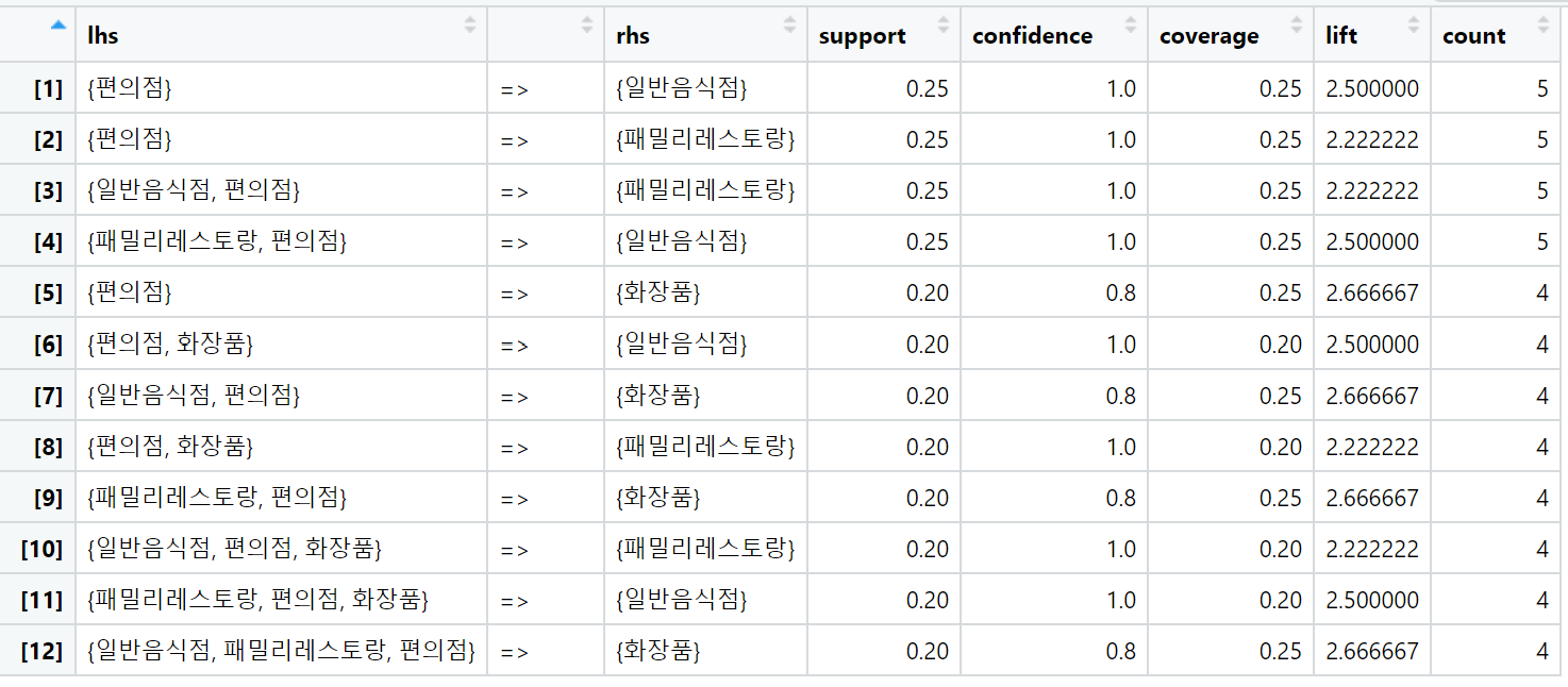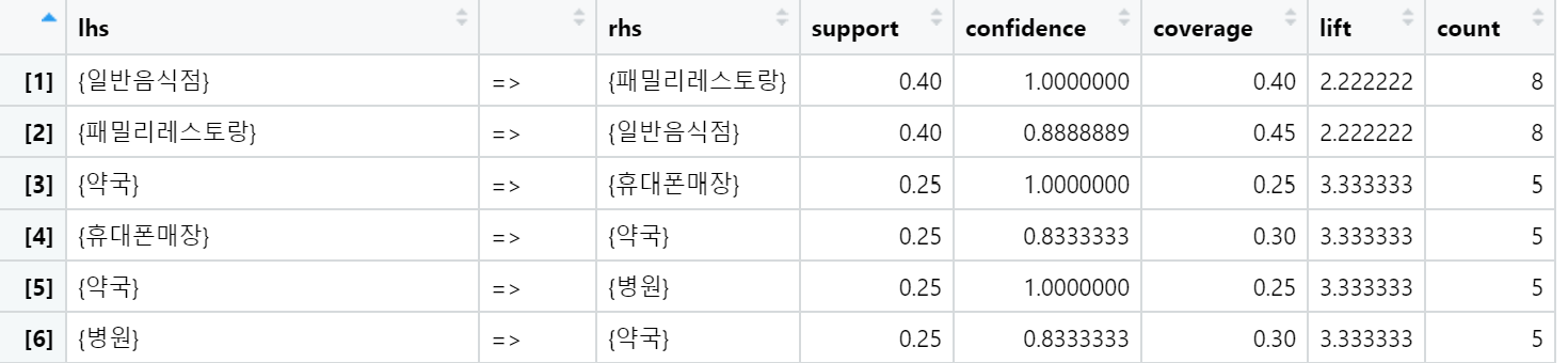 rule4 <- subset(rule2, subset = lhs %in% '편의점'&confidence > 0.7)