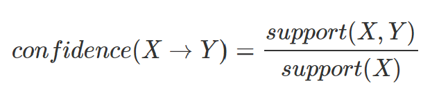 - 두 아이템 X와 Y의 지지도(n(X∩Y) : 아이템 X와 Y를 포함하는 거래 건수, N : 전체 거래 건수)