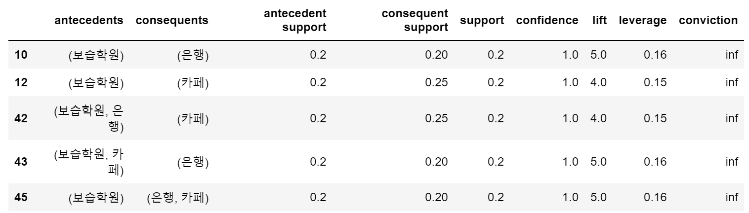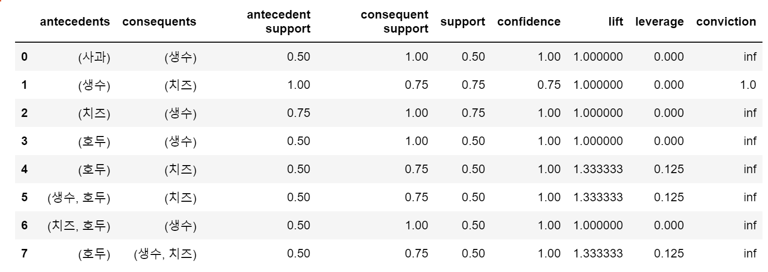 > leverage(사과→생수) : 사과와 생수가 얼마나 자주 나타나는지 빈도를 관찰해 둘 사이의 차이를 계산하여 사과와 생수가 서로 얼마나 독립적인지를 나타내는 척도. 이 값이 0이면 서로 독립
