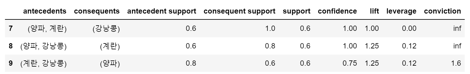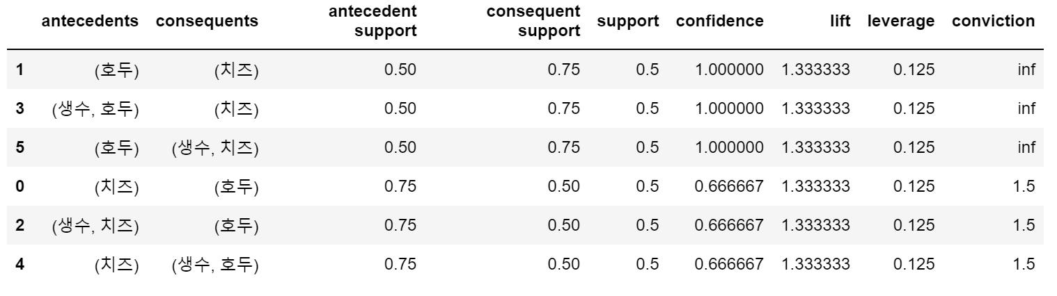 association_rules(a, metric = "confidence", min_threshold = 0.7) # 신뢰도 0.7이상만 출력