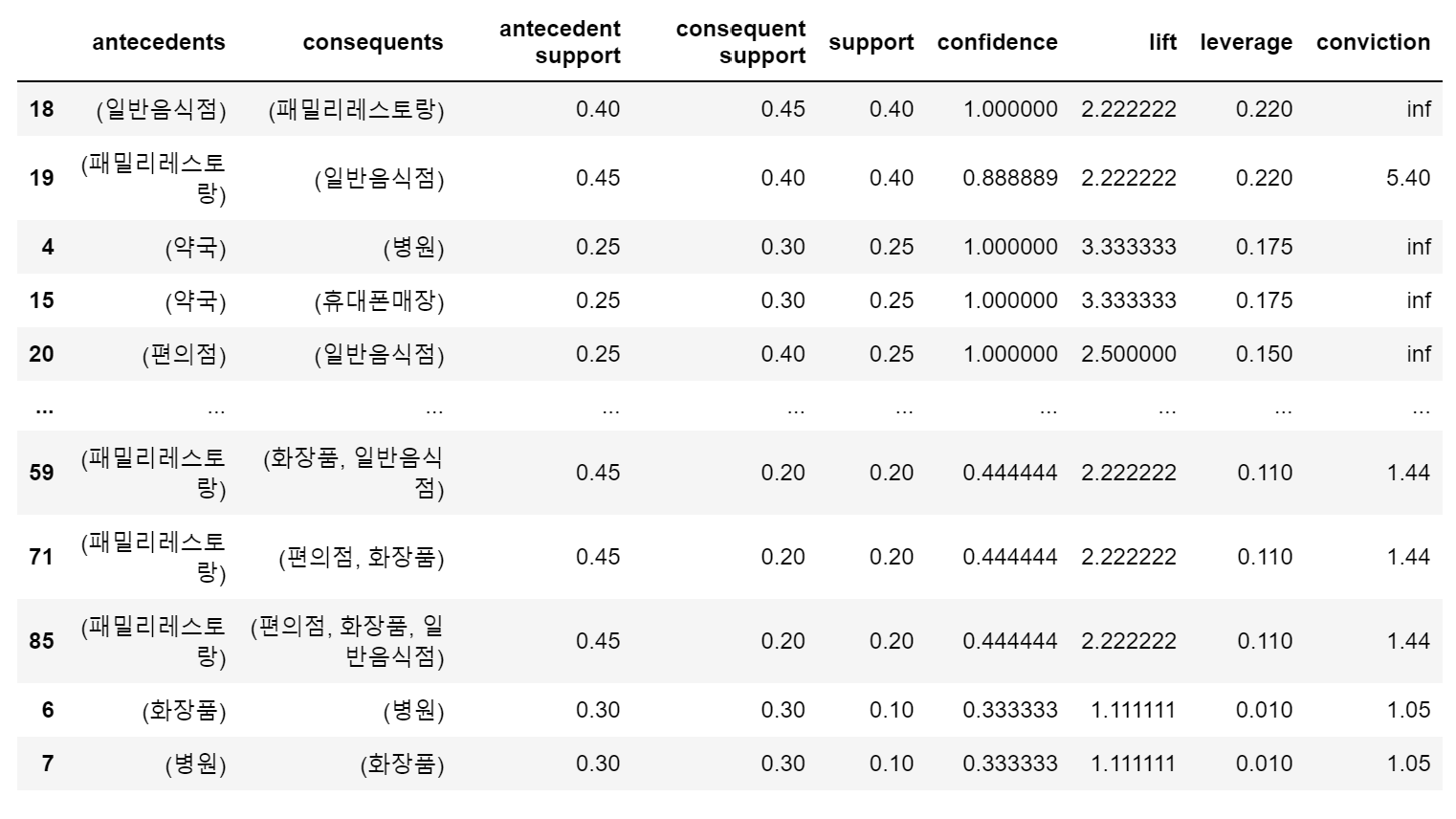 a_rules.sort_values(by = ['support','confidence'], ascending = False) #지지도, 신뢰도 asc 정렬