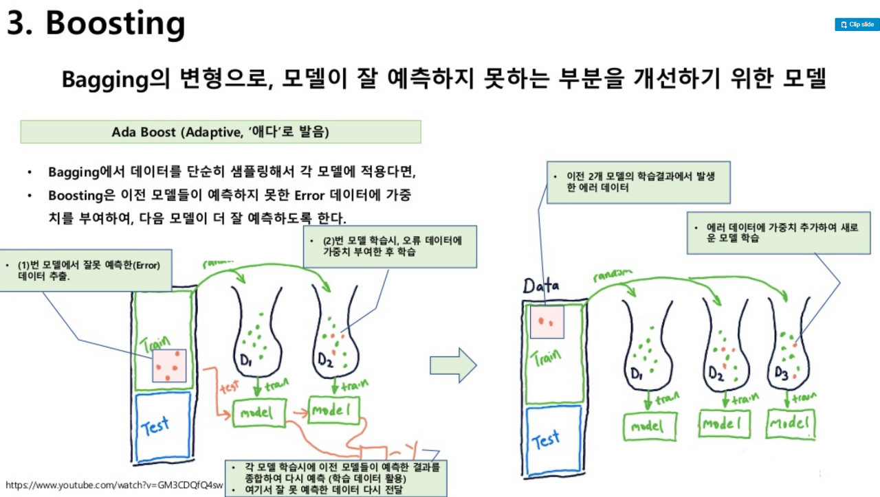 2. 부스팅(boosting) : 배깅을 개선한 앙상블 알고리즘으로 데이터를 샘플링할 때 잘못 분류한 데이터에 대해서 가중치를 주어 좀 더 많이 샘플링하여 학습할 수 있도록 하는 알고리즘.