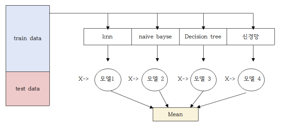 위에서 수행한 배깅과 부스팅은 의사결정트리 모델을 여러개로 만들어서 구현한 것이고, 우리가 이론 수업에서 배웠던 것처럼 여러개의 머신러닝 모델을 가지고 수치예측하기