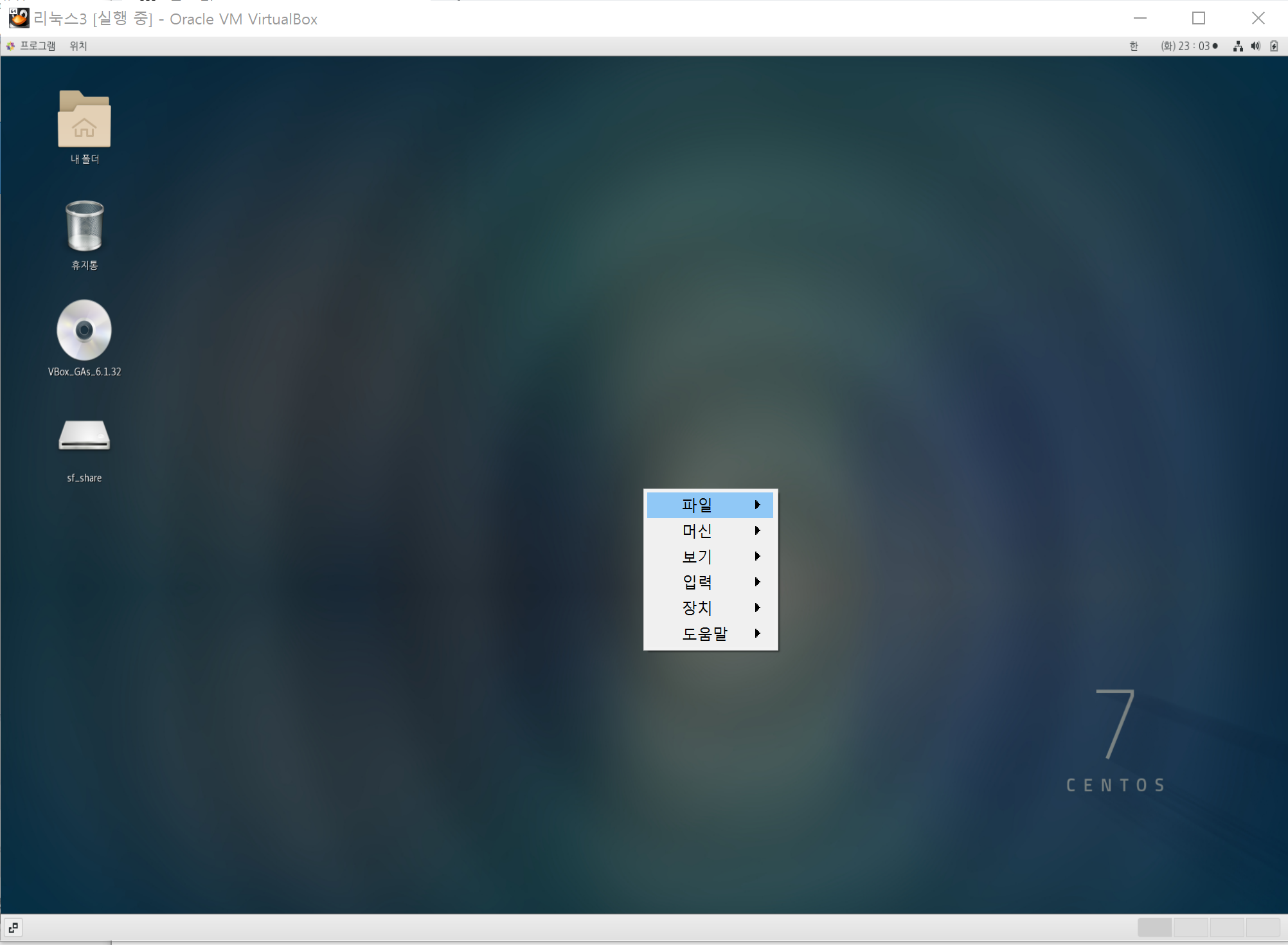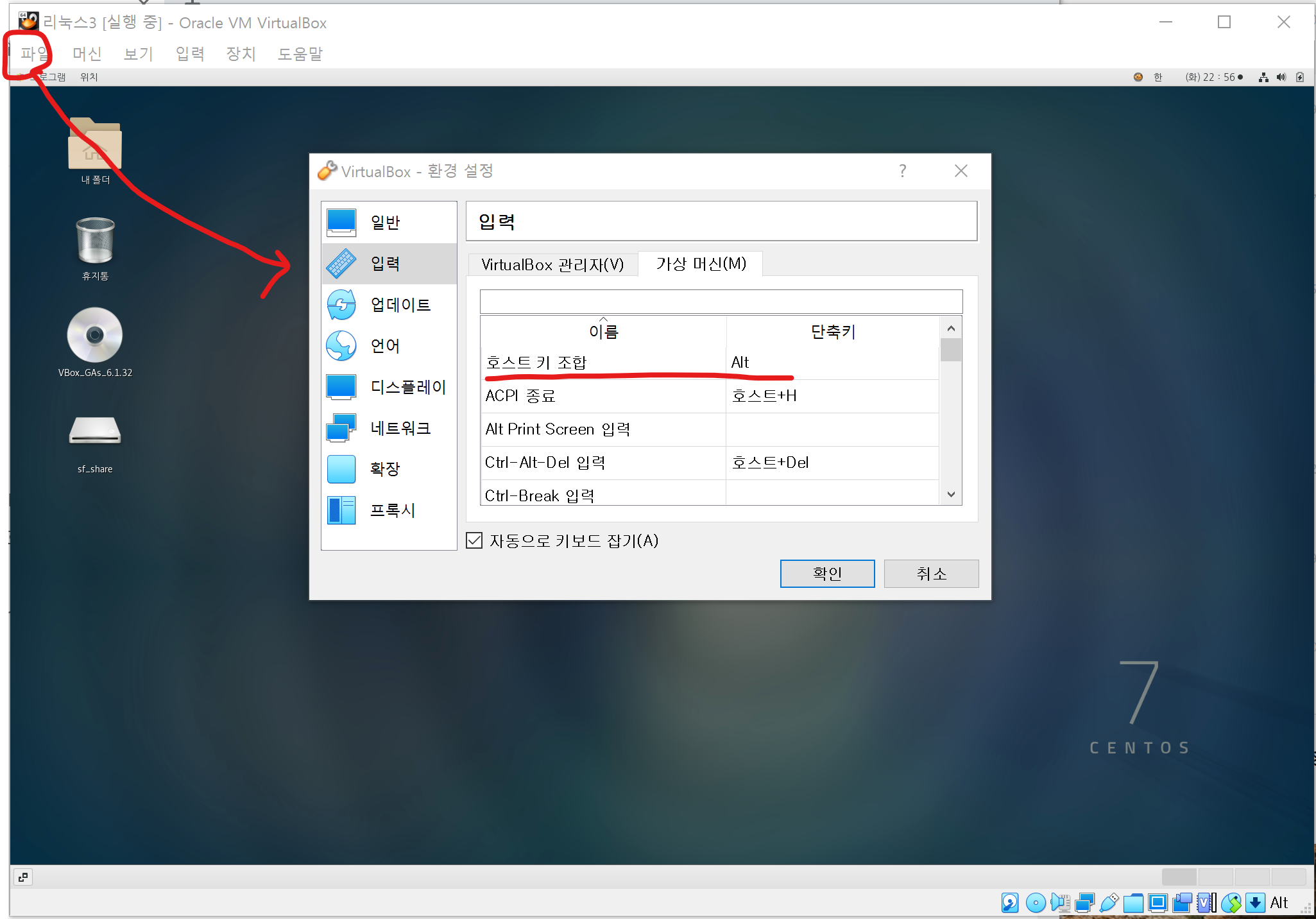 1) 우선 가상머신창 메뉴표시줄의 파일 -> 환경설정 -> 입력으로 들어가 호스트키를 변경한다. 디폴트로 Right control key가 되어 있을텐데, 보통 이 키가 잘 동작되지 않거나 불편하다. 그러므로 본인이 쓰기 편한 호스트키로 변경해준다.