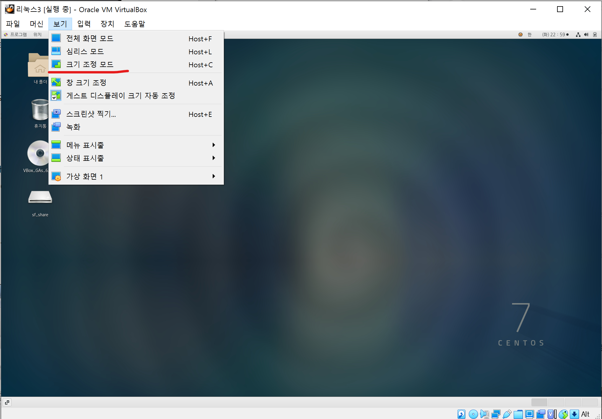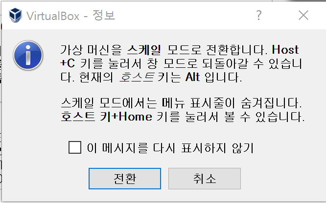 메뉴표시줄의 메뉴를 사용하고 싶을 때는 Host + c 를 눌러 창 모드로 돌아 가거나, Host + Home키로 메뉴창을 볼 수 있다.