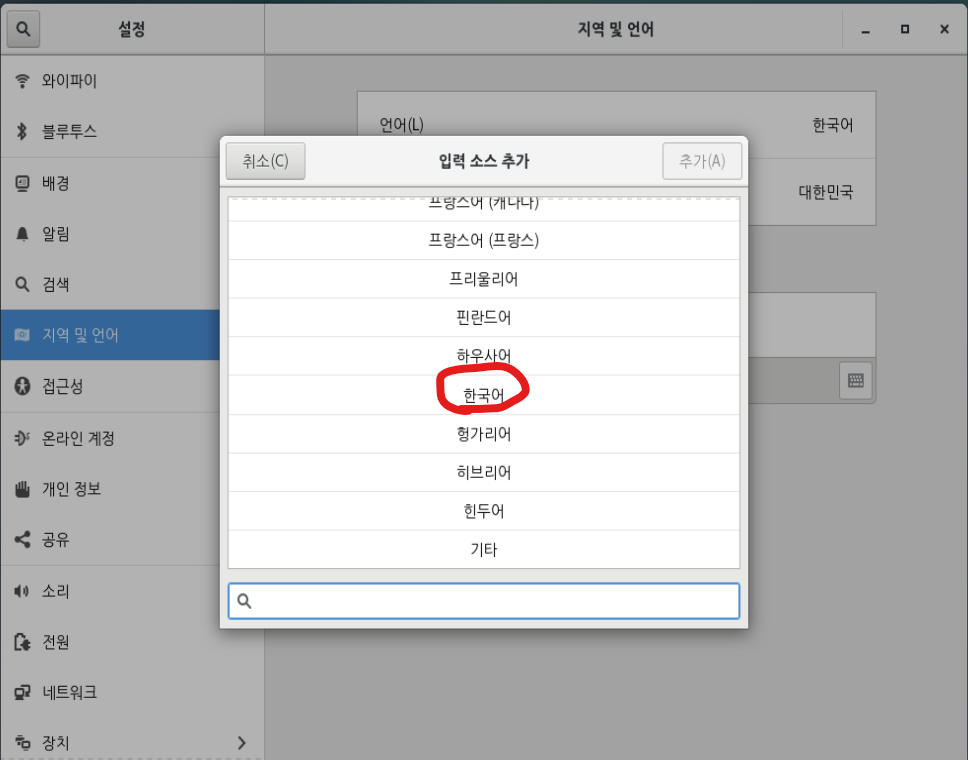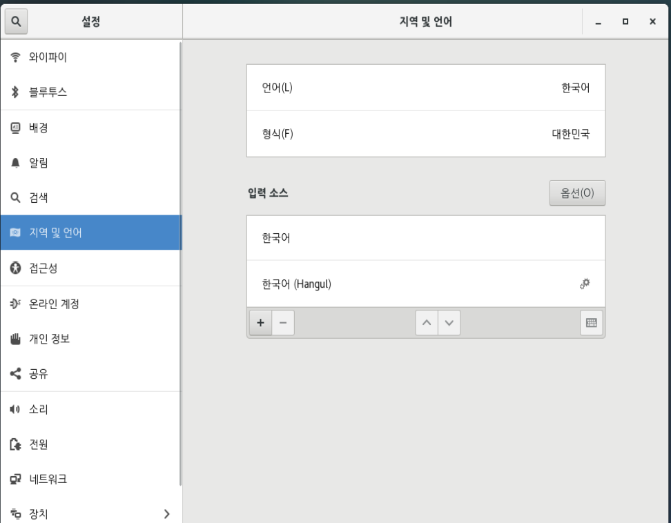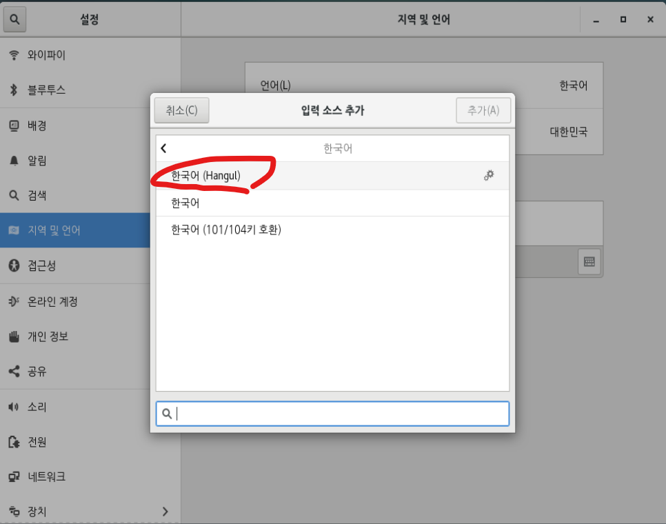 4) [한국어(Hangul)] 추가하면 입력소스에 한국어,한국어(Hangul) 가 생긴 것을 확인할 수 있다.