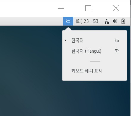 5) 이제 설정 창을 끄고 우측 상단 메뉴바로 간다. 현재 언어가 ko로 되어 있는데 클릭해서 한국어(Hangul)로 바꿔주면 된다.