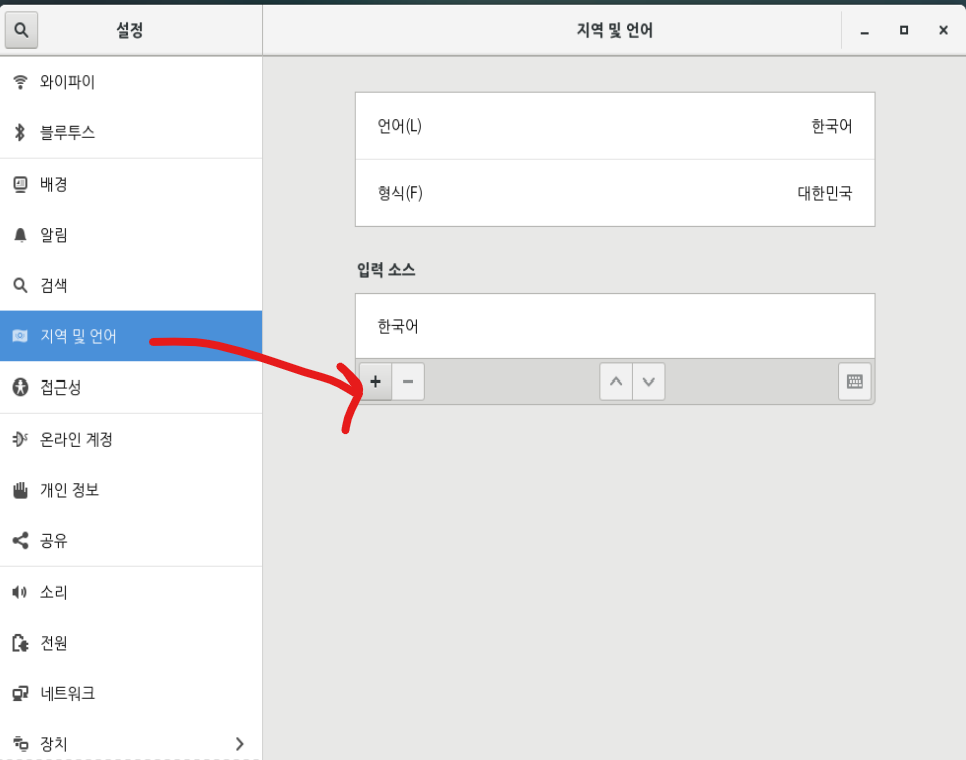 2) 지역 및 언어 -> 입력소스의 + 열기
