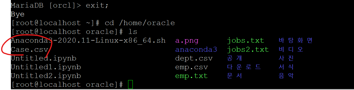 #1. 코로나 확진자 데이터인 Case.csv를 리눅스 서버에 /home/oracle 밑에 올립니다.