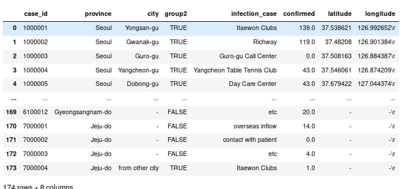 -> (case_id,province,city,group2,infection_case,confirmed,latitude,longitude);