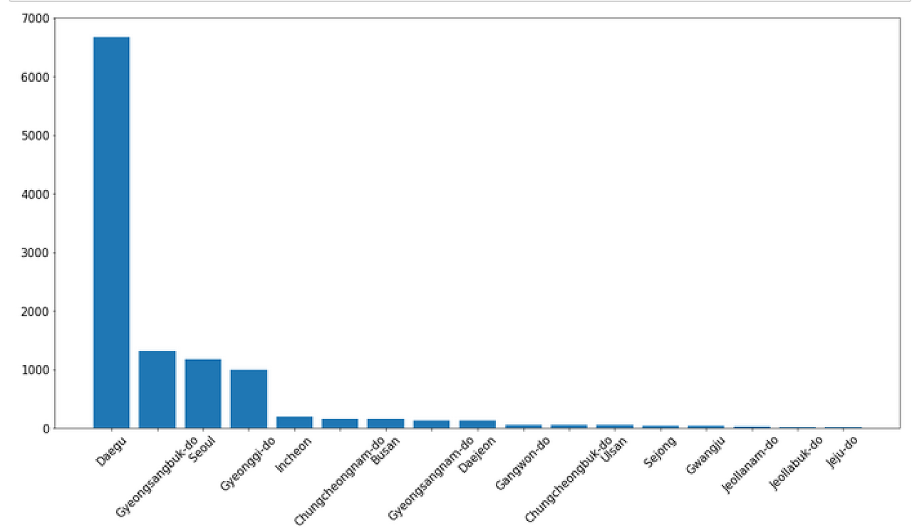 질문 : 우리나라에서 코로나 확진자가 많은 도시는 어디인가? 순위는 어떻게 되는가?