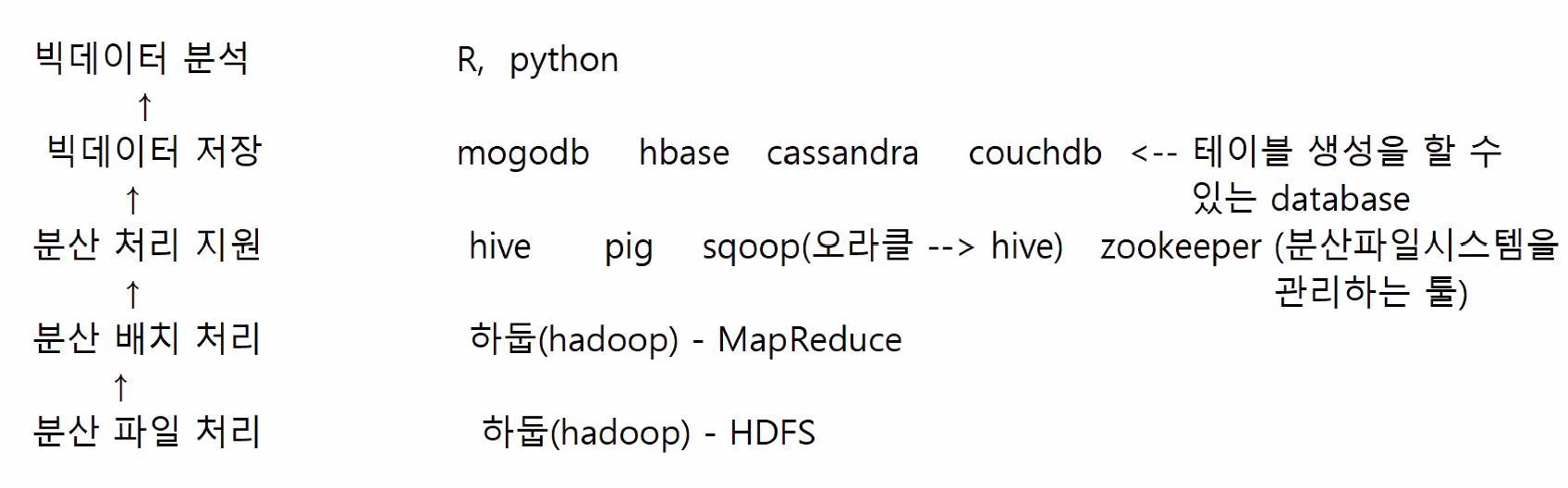 하둡은 자바로 만들어졌습니다. 자바를 가지고 빅데이터를 검색하기가 어려워 자바를 몰라도 하둡의 데이터를 쉽게 다룰 수 있도록 NoSQL이라는 기술이 나오면서 SQL과 같은 언어로 빅데이터를 다룰 수 있게 되었습니다.