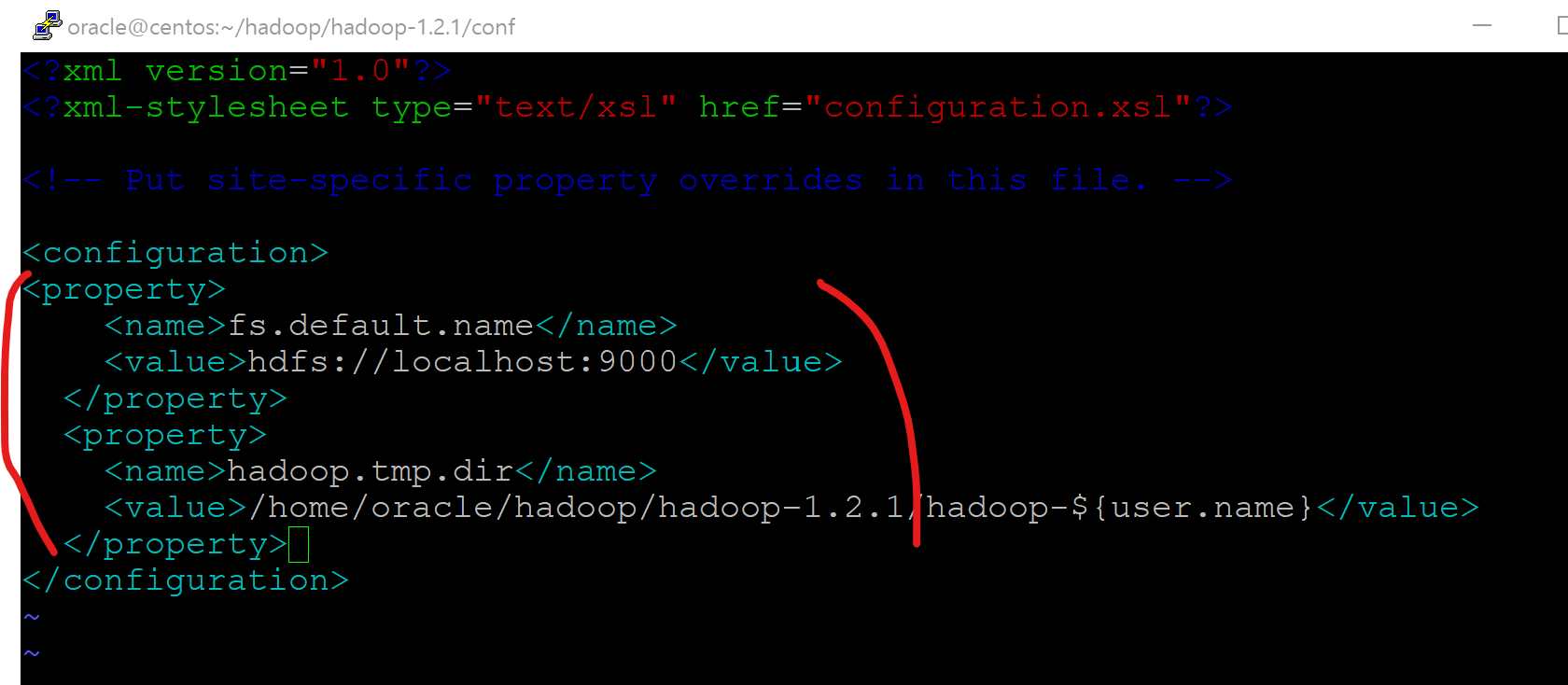<value>/home/oracle/hadoop/hadoop-1.2.1/dfs/name</value>
