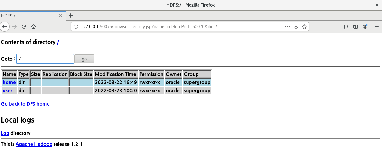 drwxr-xr-x - oracle supergroup 0 2022-03-22 16:49 /home/oracle/hadoop/hadoop-1.2.1/hadoop-oracle