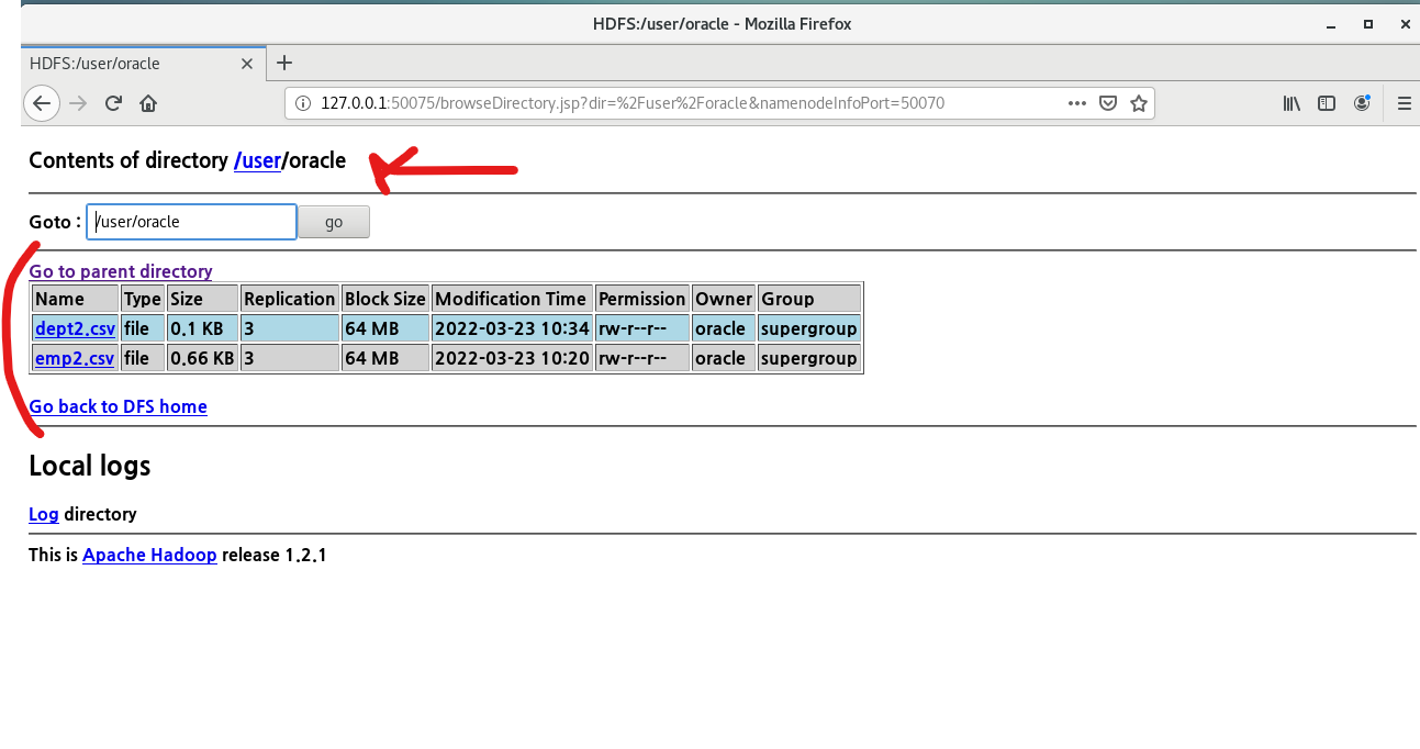 -rw-r--r-- 3 oracle supergroup 102 2022-03-23 10:34 /user/oracle/dept2.csv