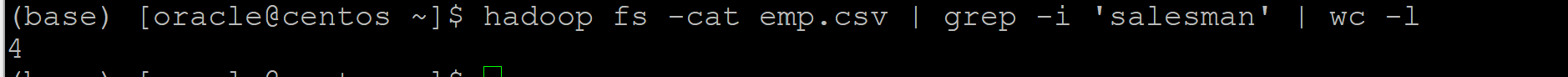 (base) [oracle@centos ~]$ hadoop fs -cat emp.csv | grep -i 'salesman' | wc -l