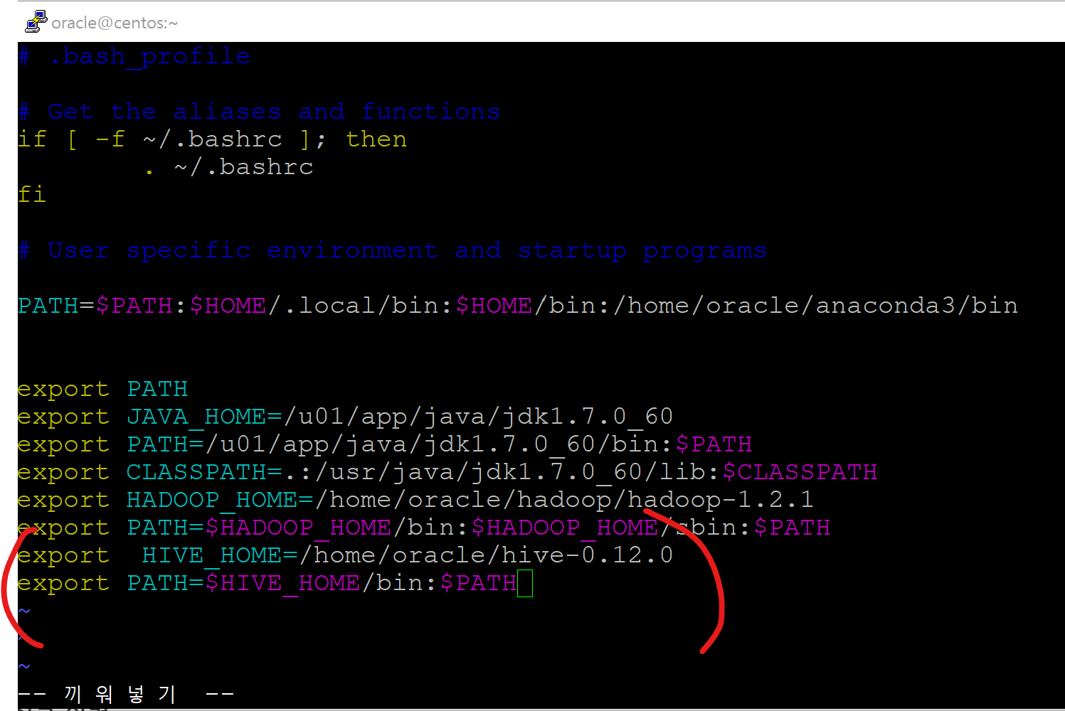 6. oracle 유져의 환경 정보 파일인 .bash_profile 에 하둡 홈 디렉토리를 지정합니다.