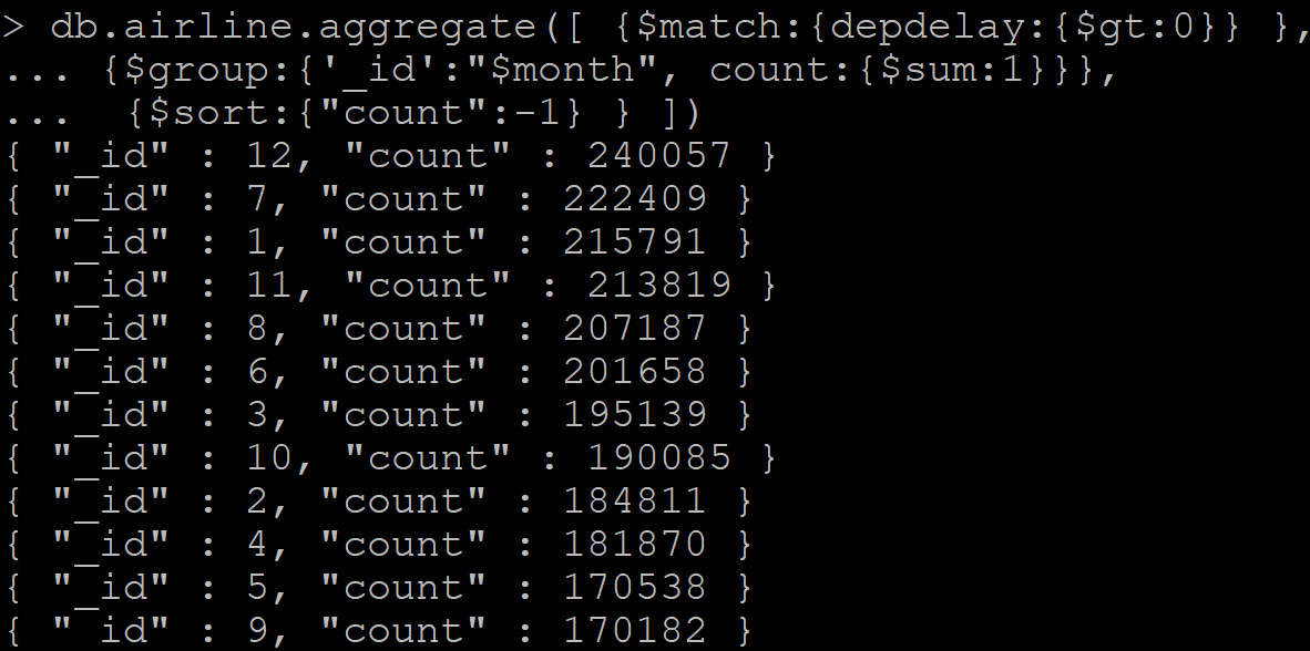 > db.airline.aggregate([ {$match:{depdelay:{$gt:0}} },