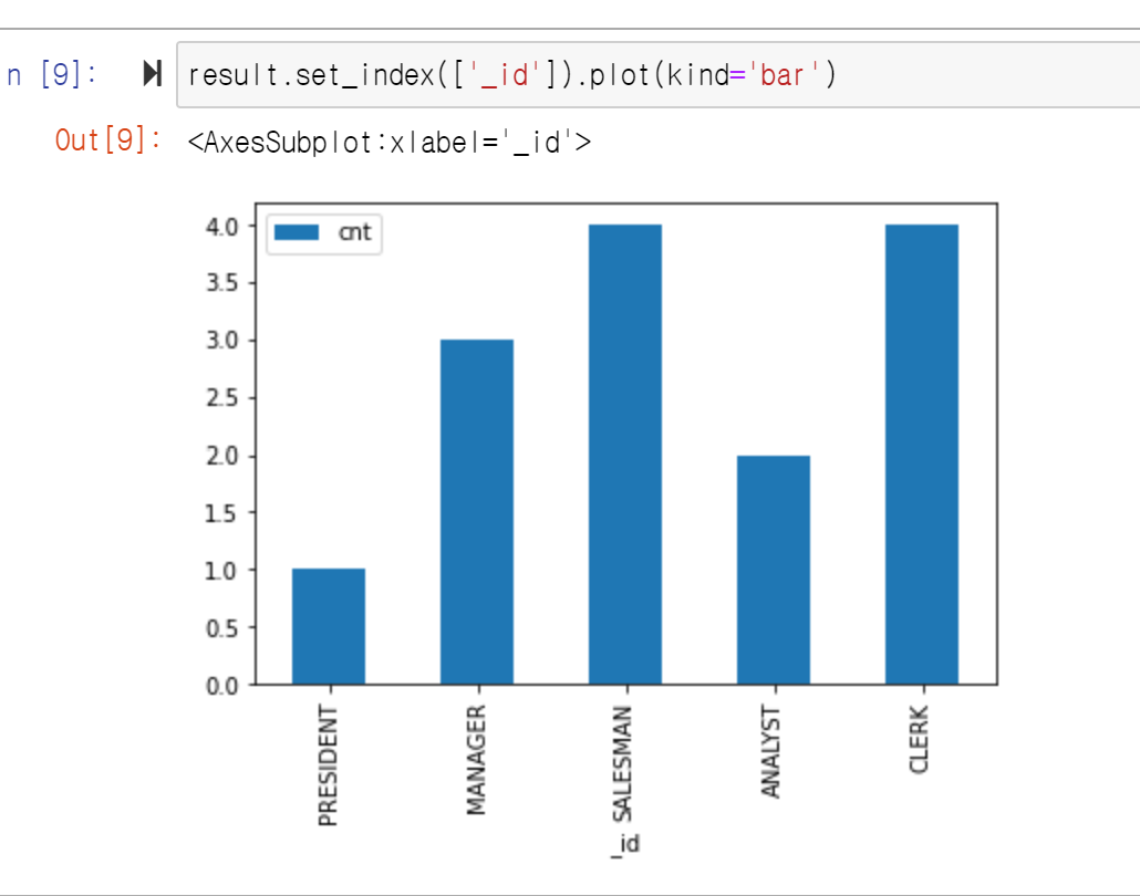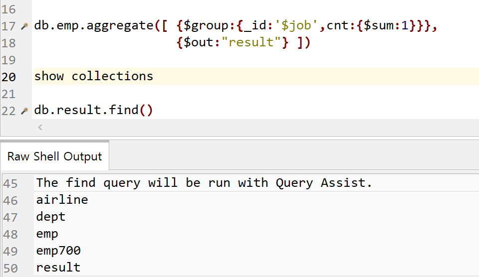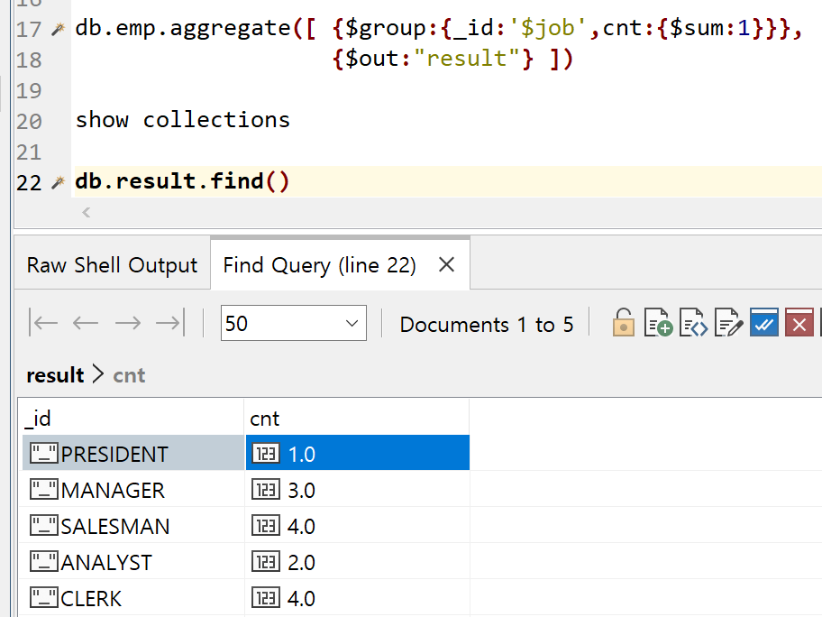 db.emp.aggregate([ {$group:{_id:'$job',cnt:{$sum:1}}},