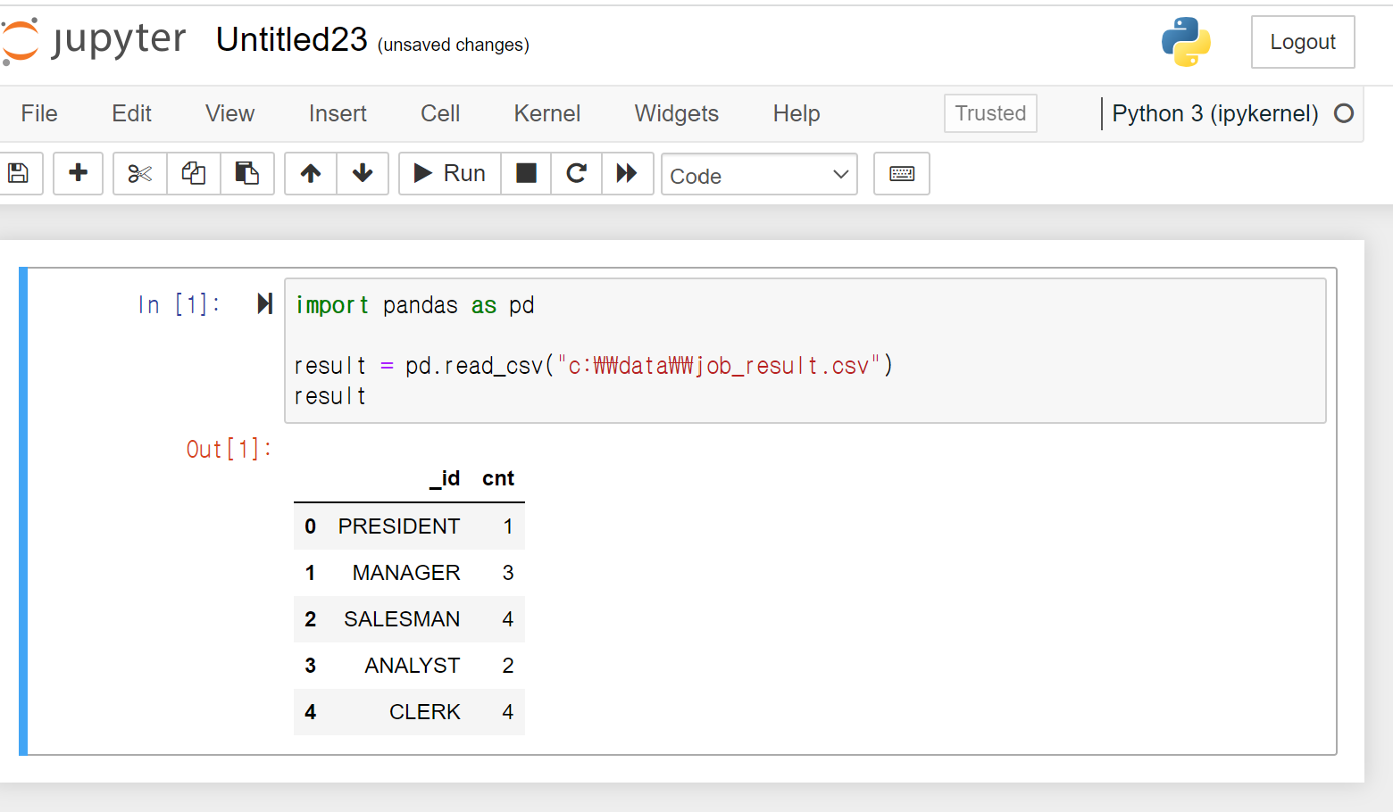 문제340. job_result.csv로 윈도우의 주피터 노브북에서 job_result라는 판다스 데이터 프레임을 생성하시오.