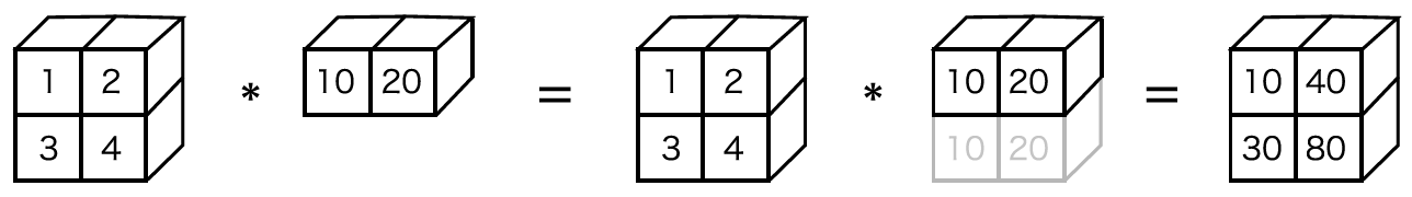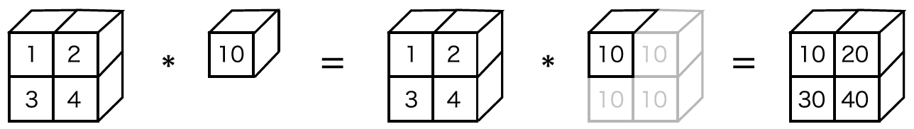 위의 그림처럼 2x2행렬과 숫자 10을 연산하기 위해서 숫자 10이 2x2 행렬로 확대된 후 연산이 이루어지는 것을 브로드 캐스트라고 함.