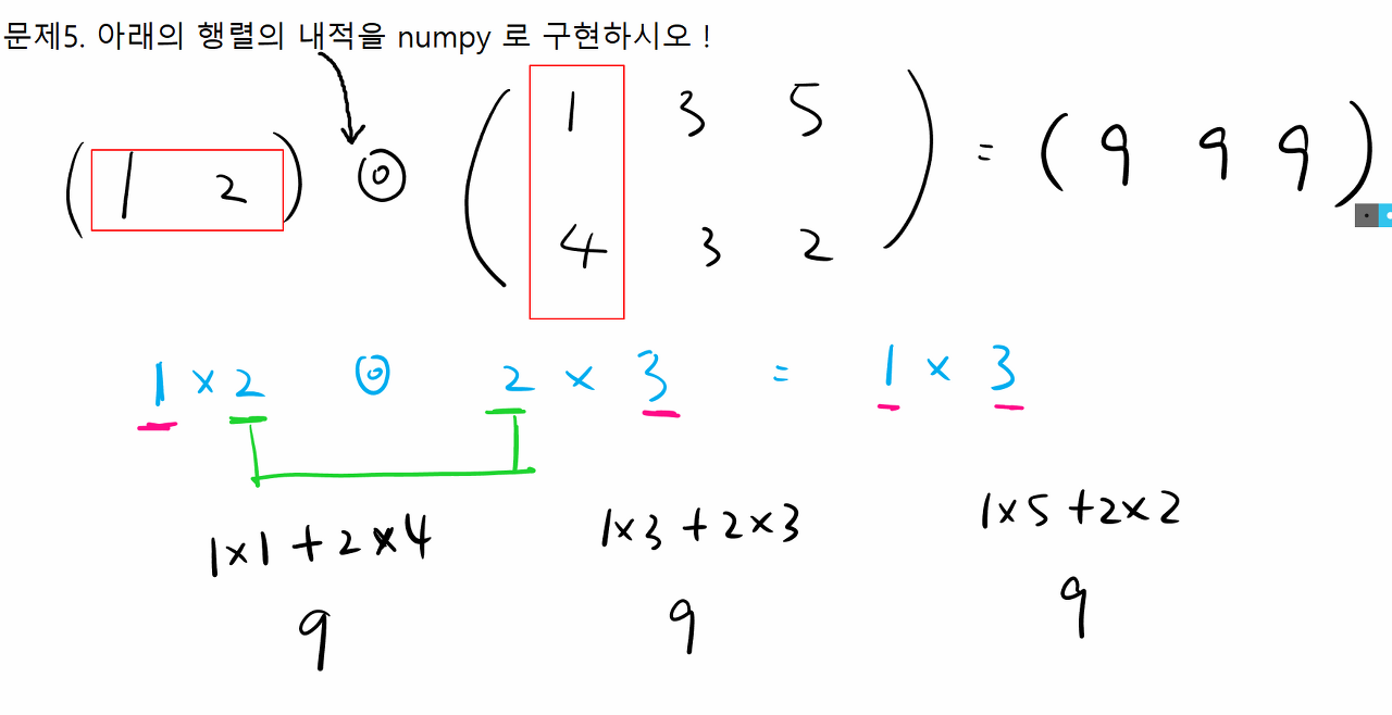 문제5. 아래 행렬의 내적을 numpy로 구현하시오.