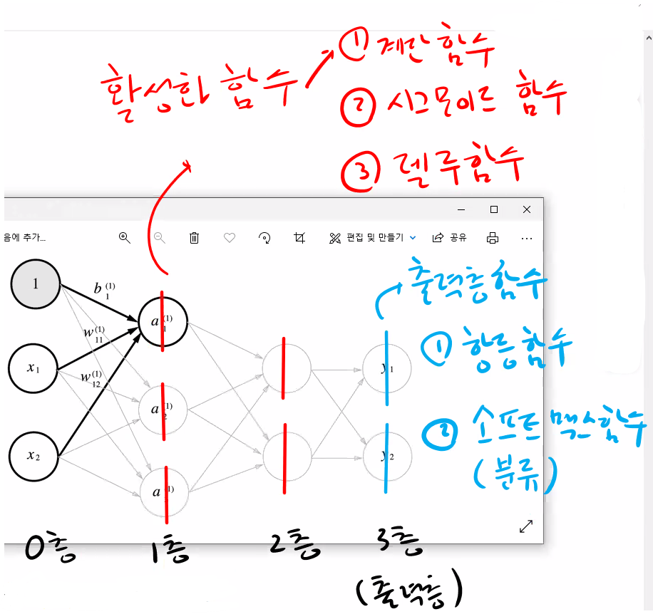 2. 출력층 함수 : 항등함수(회귀분석), 소프트맥스 함수(분류)