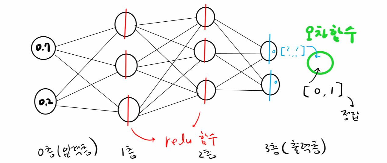 오차함수에 정답 데이터와 예측 데이터를 넣어서 오차가 어떻게 되는지 확인합니다.