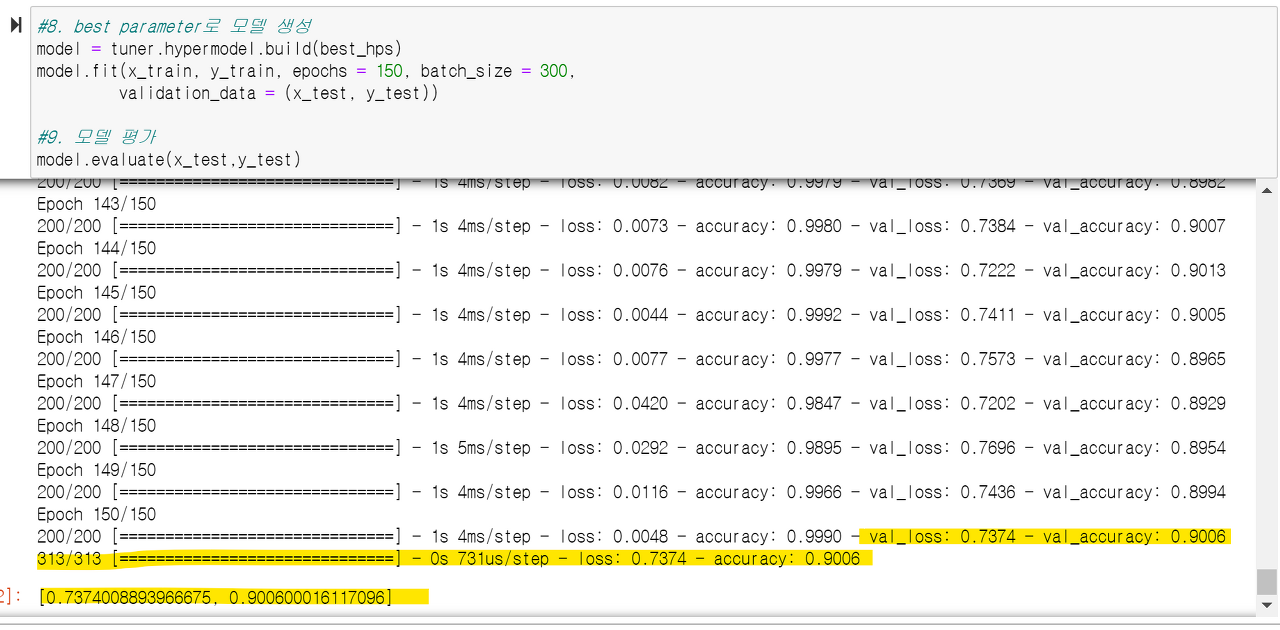print('첫번째 Dense 노드 수: %s'%best_hps.get('units1')) #여기까지 코드블럭 한번 끊기
