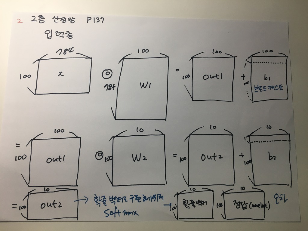 return y # 확률벡터가 100가 출력(batch size = 100), 결국 (100,10)으로 출력됨